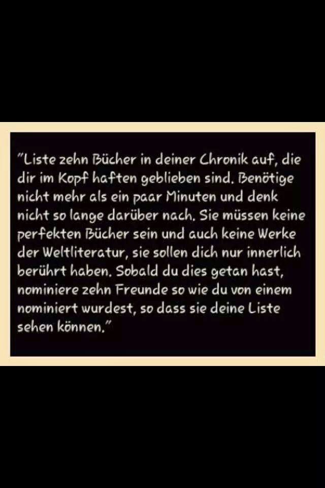 Und hier meine 10 Bücher:1. Die 13 1/2 Leben des Käpt´n Blaubär 2. Ayla und das Tal der Pferde3. Die Nebel von Avalon4. Harry Potter5. Plötzlich Fee6. City of Bones7. Selection8. Das göttliche Mädchen9. Splitterherz10. Engelskuss