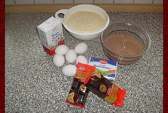 Hier alle Zutaten auf einen Blick:250g weiche Butter6 Eier250g Puderzucker250 geriebene Schokolade250g gemahlene Nüsse 100g Mehl (fehlt auf dem Bild)1 TL Backpulveretwa 300g Kuvertüre (zum Verziehren)