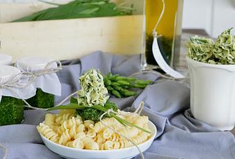Zutaten für das Bärlauchpesto:150g Bärlauch, 50g frisch geriebener Parmesan, 30g Pinienkerne, 1 EL Zitronensaft, 100ml kaltgepresstes Olivenöl, Salz, Pfeffer