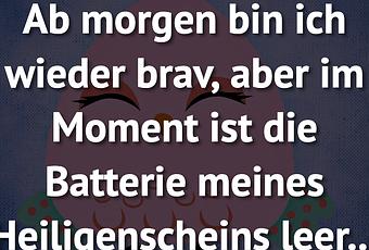 Auf Facebook teilen Vorige Folgende Ab morgen bin ich wieder brav, aber im Moment... Autor des Artikels : istdaslustig Zum Original-Artikel Ab morgen bin ich wieder brav, aber im Moment ist die Batterie meines Heiligenscheins leer... Hier geht es zum Artikel Mehr Lustiges auf www.istdaslustig.de Auf Facebook teilen Vorige Folgende Das könnte Ihnen gefallen Mehr