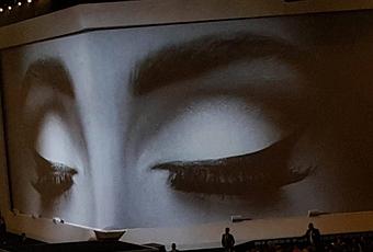 obwohl wir „nur“ eine der mittleren Preiskategorien gekauft hatten. Am anderen Hallenende wurde die Hauptbühne von einer gigantischen Leinwand geziert, auf der die ganze Zeit Adeles geschlossene Augen zu sehen waren. Ein ziemlich beeindruckender Anblick. Kurz nach 20 Uhr wurde das Publikum merklich aufgeregter, die Arena, die bis auf den letzten Platz ausverkauft war, hatte sich gefüllt und jeder saß auf seinem Platz. Durch einen Gang zwischen den Zuschauern auf den Parkettplätzen wurde eine große Kiste geschoben. Wir scherzten noch: „Da wird sie doch wohl nicht drin sein, oder?“ Der Kasten wurde unter die Bühne geschoben, der Mittelteil fuhr hinab. Das Licht ging aus. Mit einem „Hello?“ öffneten sich die Augen der Leinwand-Adele. Zwei weitere „Hello?“ Hinreißende Augenaufschläge auf der Leinwand. Die Musik begann, das Publikum applaudierte Lautstark. Die Plattform fuhr hoch und in der Mitte begann Adele, ihren Hit „Hello“ zu singen.