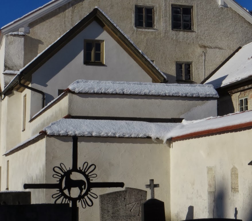 Noch vor der Mittagszeit nahmen wir den Bus zurück in Richtung Füssen, stiegen aber vor Schwangau aus, im Nachbarort Halblech, Ortsteil Trauchgau. Von der Bushaltestelle am Gasthof Post gingen wir nicht durch die Straßen im Wohngebiet, sondern entlang eines Baches und der Parkplätze für die Festbesucher sozusagen "von hinten" via Friedhof auf den Platz vor der Kirche St. Andreas, wo der Hauptteil des Weihnachtsmarktes stattfindet. Auf diesem Weg konnten wir einige Winteraufnahmen im Gegenlicht machen: