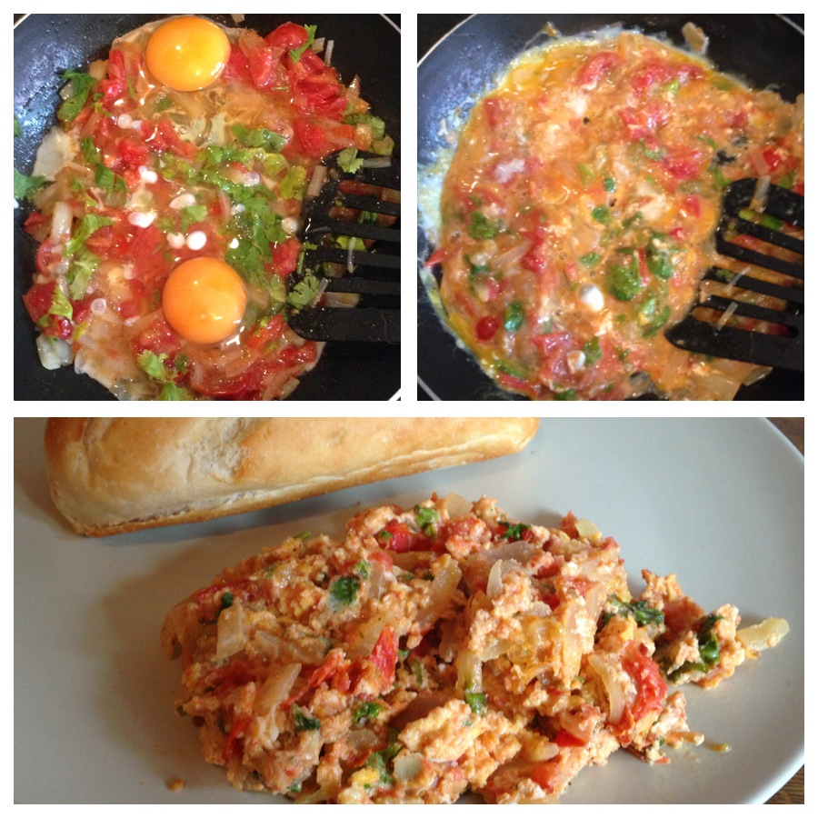 Wenn ich am Wochenende bei afghanischen Verwandten war, habe ich mich immer auf das Frühstück gefreut. Neben Käse, Wurst und Brot gibt es meistens eine leckere Eierpfanne, die durch frischen Koriander ihren unverwechselbaren Geschmack erhält. Ebenfalls charakteristisch sind viele Zwiebeln, Tomaten und Öl. Leider schmecken die Eier am besten, wenn man die Zwiebeln und Tomaten in reichlich Öl anbrät und dann die Eier dazugibt. Öl ist nunmal ein Geschmacksträger, hält dafür aber auch länger satt. Also darf es ruhig etwas mehr sein ;-)Tokhum Bonjan-e-Roomi(Tokhum = Ei; Bonjan-e-Roomi = Tomate)Für eine gute Portion benötigt ihr:2 Eier1 kleine Zwiebel1 große Tomatefr. KorianderSalz, PfefferChili + Knoblauch nach BeliebenAls erstes müssen die kleingehackten Zwiebeln in Öl gegeben und angebraten werden. Nach ein paar Minuten können die Tomaten hinzugefügt werden. Wenn das Gemüse die gewünschte Sämigkeit erreicht hat, ist der gehackte Koriander hinzuzufügen und alles ist mit Salz und Pfeffer abzuschmecken (ich habe noch etwas Knobi-Pulver reingetan). Gut vermengen, dann die beiden Eier reinschlagen und rühren. Immer wieder etwas anbraten lassen, dann wenden und rühren. Passt auf, dass die Eier nicht zu trocken werden, dann schmecken sie nicht mehr so gut. Mit warmen Brot servieren und im besten Fall Sheer Chai (süßer Tee mit Milch) oder süßen Tee dazu reichen.