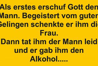 Auf Facebook teilen Vorige Folgende Als erstes erschuf Gott den Mann. Begeistert... Autor des Artikels : istdaslustig Zum Original-Artikel Als erstes erschuf Gott den Mann. Begeistert vom guten Gelingen schenkte er ihm die Frau. Dann tat ihm der Mann leid und er gab ihm den Alkohol..... Hier geht es zum Artikel Mehr Lustiges auf www.istdaslustig.de Auf Facebook teilen Vorige Folgende Das könnte Ihnen gefallen Mehr