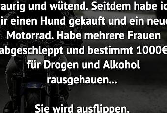 Als meine Frau ging, war ich einsam, traurig und wütend. Seitdem habe ich mir einen Hund gekauft und ein neues Motorrad. Habe mehrere Frauen abgeschleppt und bestimmt 1000€ für Drogen und Alkohol rausgehauen...