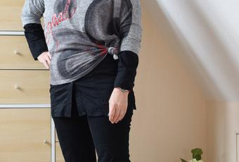 Als ich mir das Oberteil mit Fledermaus-Ärmeln in hellen, gedeckten Grautönen kaufte wusste ich sofort, dass es ohne Hilfsmittel nicht zu meinem Farbtyp passt. Schon gar nicht an mein Gesicht. Das funktioniert nur mit Kontrastfarben.