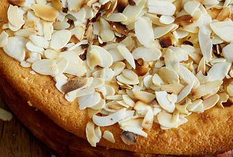 Den Cheesecake abkühlen lassen, aus der Form lösen und mit den Mandelblättchen bestreuen.