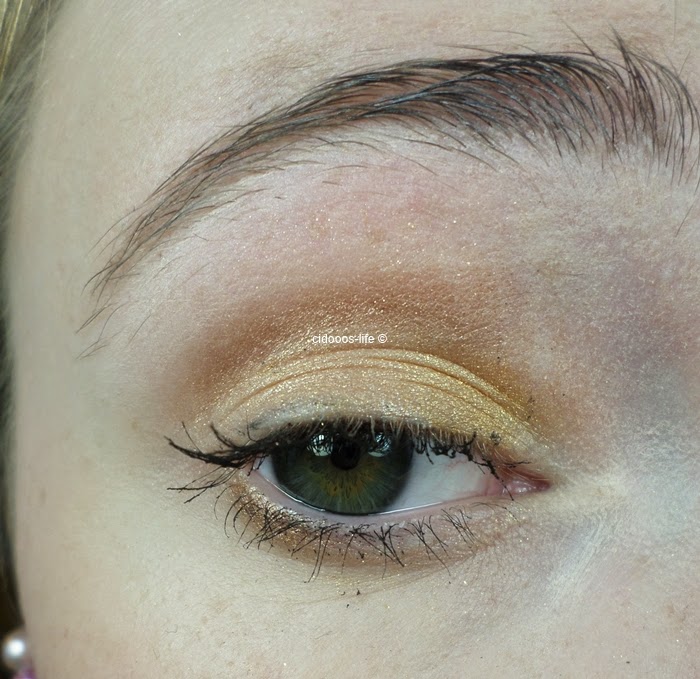 Ich hab den gelben Ton auf das komplette Lid aufgetragen, in die Lidfalte habe ich dann eine Mischung aus dem Ton rechts daneben und darüber gegeben.