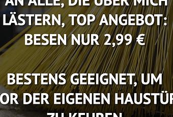 Auf Facebook teilen Vorige Folgende AN ALLE, DIE ÜBER MICH LÄSTERN, TOP ANGEBOT:... Autor des Artikels : istdaslustig Zum Original-Artikel AN ALLE, DIE ÜBER MICH LÄSTERN, TOP ANGEBOT: BESEN NUR 2,99 € BESTENS GEEIGNET, UM VOR DER EIGENEN HAUSTÜR ZU KEHREN. Hier geht es zum Artikel Mehr Lustiges auf www.istdaslustig.de Auf Facebook teilen Vorige Folgende Das könnte Ihnen gefallen Mehr