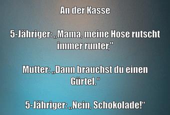 Auf Facebook teilen Vorige Folgende An der Kasse 5-Jähriger: „Mama, meine Hose... Autor des Artikels : istdaslustig Zum Original-Artikel An der Kasse 5-Jähriger: „Mama, meine Hose rutscht immer runter," Mutter: „Dann brauchst du einen Gürtel.“ 5-Jähriger: „Nein, Schokolade!“ Hier geht es zum Artikel Mehr Lustiges auf www.istdaslustig.de Auf Facebook teilen Vorige Folgende Das könnte Ihnen gefallen Mehr