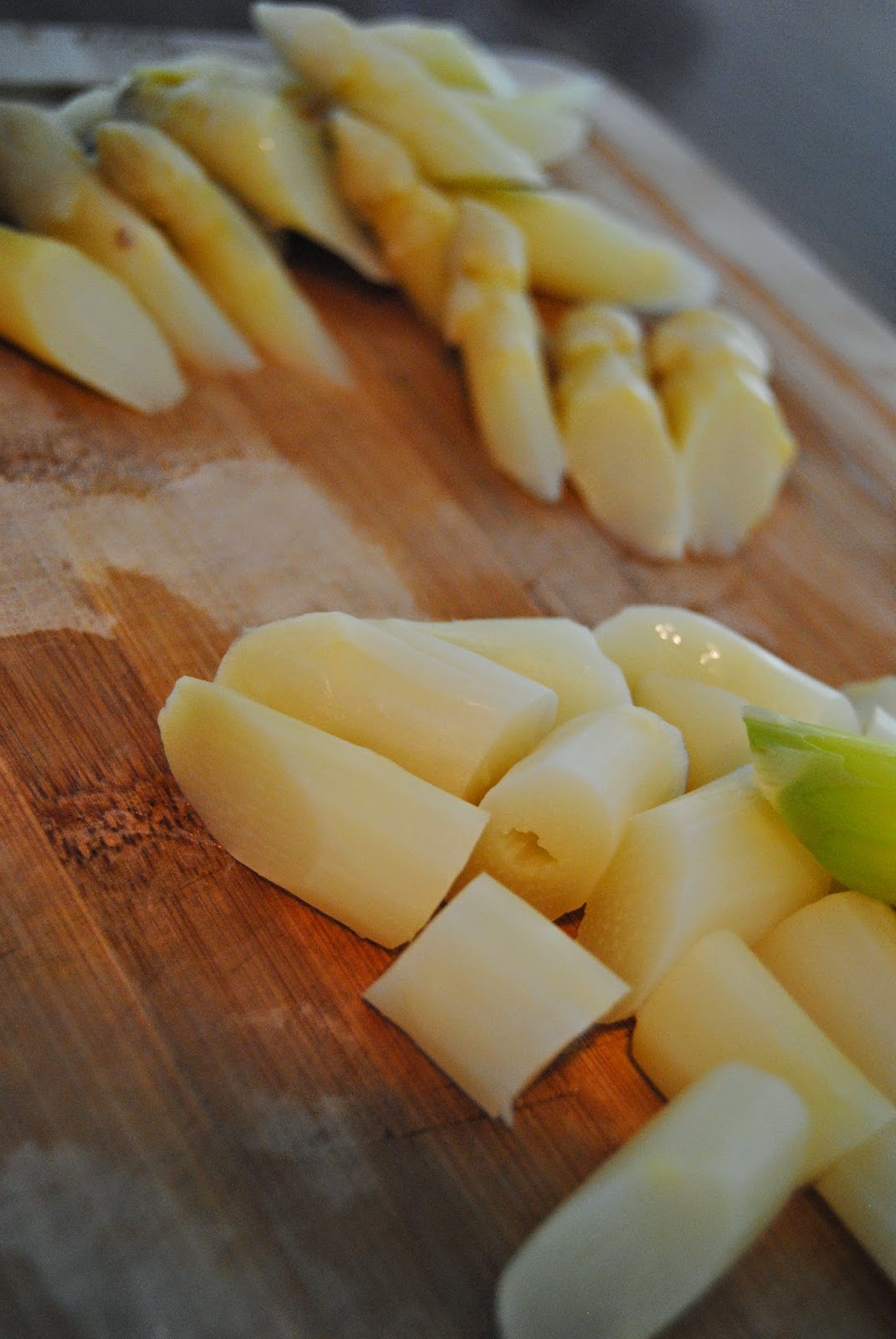 Als nächstes schäle ich den Spargel. Die Schalen werfe ich nicht weg, sondern gebe sie mit in die Brühe hinein. Die geschälten Spargel wickle ich bis zur Weiterverarbeitung in ein feuchtes Küchentuch.