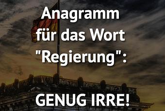 Auf Facebook teilen Vorige Folgende Anagramm für das Wort "Regierung": GENUG IRRE! Autor des Artikels : istdaslustig Zum Original-Artikel Anagramm für das Wort "Regierung": GENUG IRRE! Hier geht es zum Artikel Mehr Lustiges auf www.istdaslustig.de Auf Facebook teilen Vorige Folgende Das könnte Ihnen gefallen Mehr