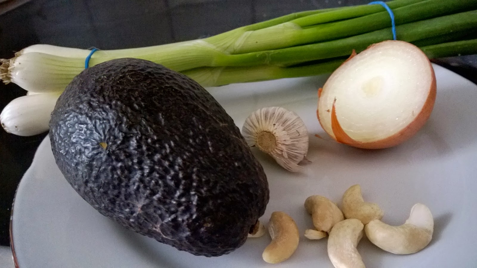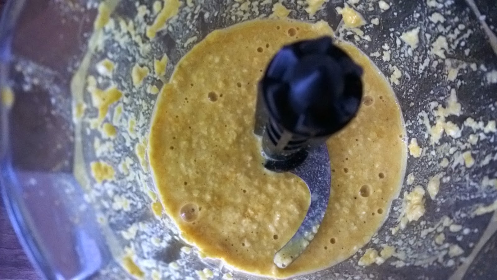 Man nehme einfach die Cashewkerne, das Öl, die Gewürze und den Senf und mache daraus eine wohlriechende Pampe. Am besten macht sich das mit einem Mixer. Damit die Cashewkerne schön klein und breiig werden, kann man sie in lauwarmen Wasser etwas chillen lassen, während man die anderen Dinge zurecht schneidet. Wer faul ist und nicht gerne Zwiebeln schneidet kann die halbe Zwiebel und die Knoblauchzehe auch gleich dazu packen - dann hat man alles winzig klein, schön breiig und es schmeckt super.
