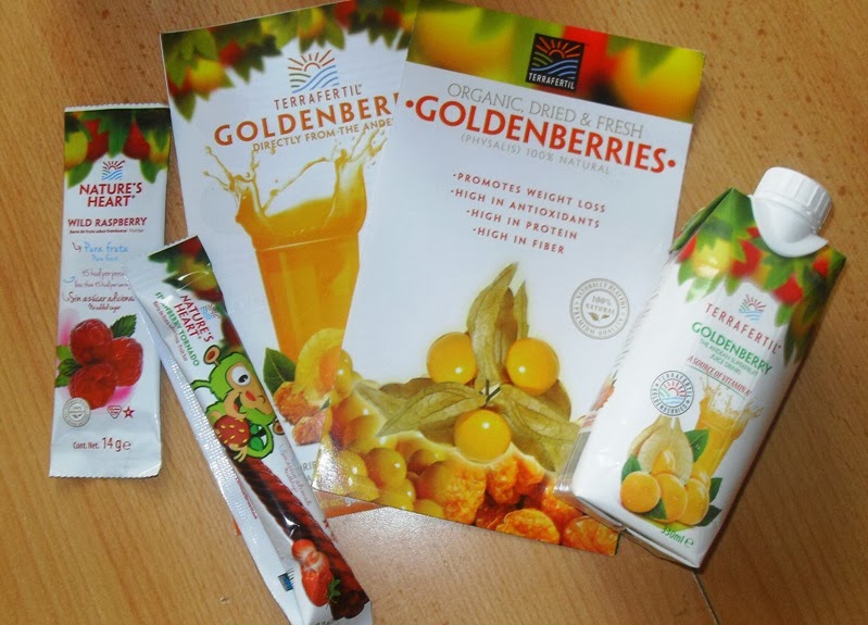 An dieser Stelle auch noch mal danke an Rio Miura, die nette Dame auf dem Foto in der Mitte, die uns so herzlich und überzeugend von den David Rio Chais überzeugen konnte :-)Ein weiterer Stand fiel mir ebenfalls positiv auf durch die Gestaltung und dadurch, das es hier etwas zum Probieren gab, das ich vorher noch nie gesehen hatte: getrocknete Physialis.Der Stand war vom Hersteller Terrafertil GoldenberryEigentlich bin ich kein Freund von getrockneten Früchten, aber diese kleinen Happen sind wirklich außergewöhnlich lecker und schmackhaft.Es handelt sich hierbei um gefriergetrocknete Früchte und sie sind sehr gesund:-sie beinhalten Vitamin C, Phosphor, Eisen und Magnesium- sie enthalten rund 32% weniger Zucker als Cranberries- voller Ballaststoffe und Antioxidantien- sie enthalten mehr Kalium als 3 mittelgroße BananenMan kann sie pur essen, ins Müsli mixen oder aber auch verbacken.Ich persönlich halte sie für einen tollen Snack, den man auch getrost seinen Kindern anbieten kann und auf meine ersten Backversuche mit den kleinen getrockneten Früchten freue ich mich auch schon :-)Die Mitarbeiterin am Stand erklärte mir, das Aldi einen "großen Vertrag" mit der Firma geschlossen hätte, so das wir bald die leckeren kleinen Früchtchen bei dem Trockenobstsortiment finden würden :-) Ich halte jetzt schon immer Ausschau, aber leider hat unser Aldimarkt noch keine Goldenberries im Sortiment.