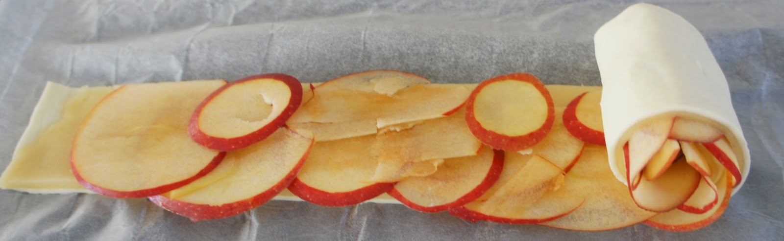 Das Marzipan mit Puderzucker bestäuben und auf die Größe vom Blätterteig ausrollen, danach auf den Blätterteig legen.Den Blätterteig der Länge nach in 6 gleich breite Streifen schneiden. Die Äpfel entweder mit einem Messer in dünne Scheiben schneiden oder mittels V-Hobel dünn hobeln. Die Scheiben schuppenartig auf die Blätterteigstreifen verteilen.