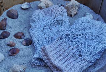 Gerade bin ich noch dabei aus sehr dünner Wolle welche zu machen. Diese werden richtig weich und zart werden. Dabei gibt es nur diesen Muschelrand und dann gleich das Bündchen mit Daumenloch.