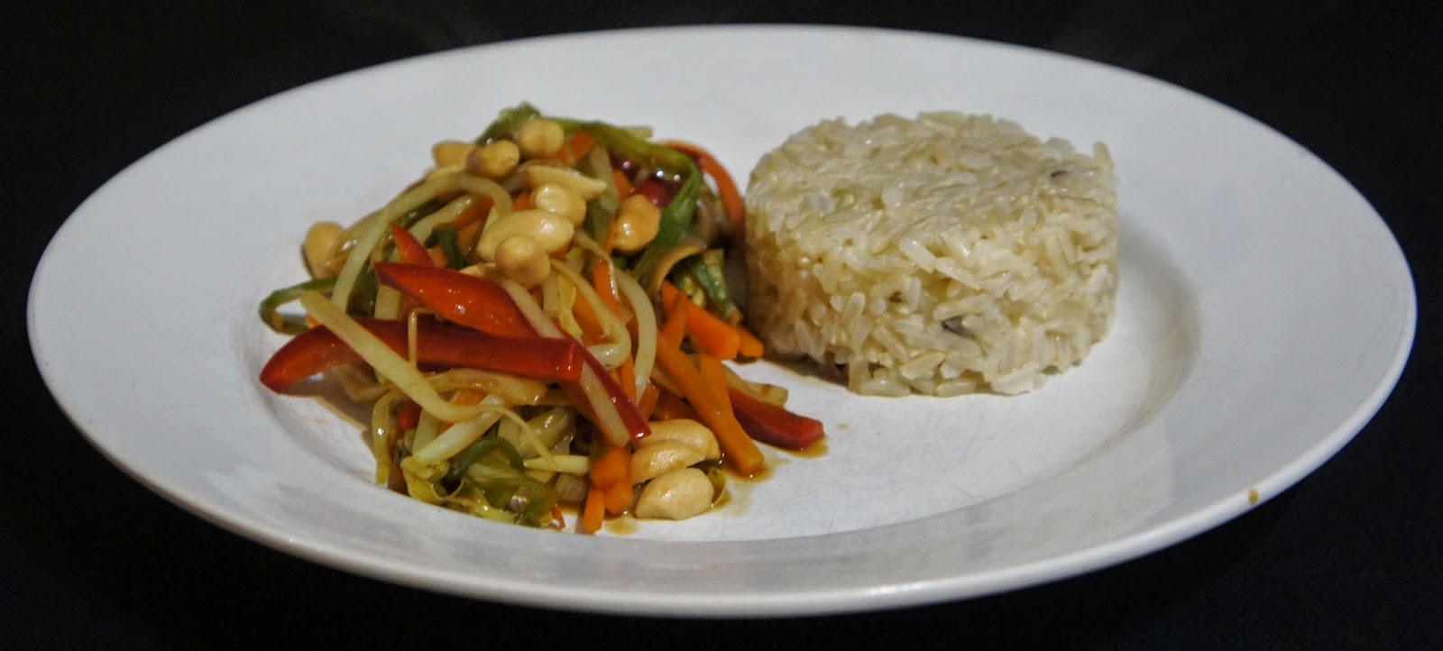 Das Gemüse in schmale Streifen schneiden, den Ingwer ganz fein hacken. In einer Pfanne das Erdnussöl erhitzen und als erstes die Pilze hinzufügen und diese anbraten, danach den Paprika und die Karotten dazugeben, mit dem Gemüsefond ablöschen und kurz aufkochen lassen, sodass Karotten und Paprika bissfest garen können. Sojasauce, Agavendicksaft und die ganzen Gewürze dazugeben.Kurz vor dem servieren die Sprossen, Lauchzwiebelstreifen und Erdnüsse dazugeben und abschmecken.