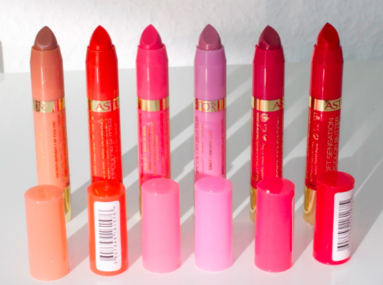 Hier möchte ich euch die 6 Farben der relativ neuen Astor Soft Sensation Lipcolor Butter zeigen. Ich muss sagen ich bin wirklich begeistert von ihnen. Satt in der Farbabgabe, buttrig weich auf den Lippen und wirklich gut im Auftrag und Tragegefühl. Sie halten auch erstaunlicherweise einiges aus - natürlich weniger als ein Lippenstift - aber zwei bis drei Stunden habe ich deutlich Farbe auf den Lippen. Insgesamt gibt es 12 verschiedene Farben, so wird auch jeder fündig. Der Farbstift lässt sich ähnlich wie bei den Chubby Sticks von Clinique herausdrehen und somit wird ein anspitzen hinfällig. Die Hülse ist in der jeweiligen Lipbutterfarbe gehalten und mit goldener Schrift versehen.