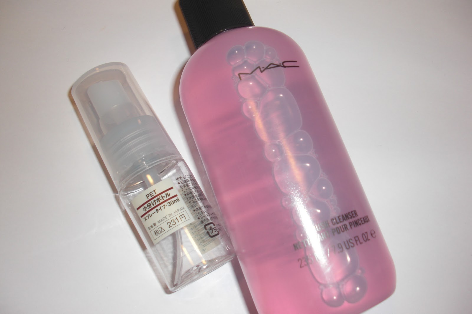 Nämlich den MAC Brush Cleanser. Einfach bei Muji ein kleines Sprühfläschchen gekauft. So wird der Verbrauch minimiert, da durch die riesen Öffnung nicht immer so viel Reiniger rausläuft. Ausserdem kann man ihn so sehr praktisch mit auf Reisen nehmen.
