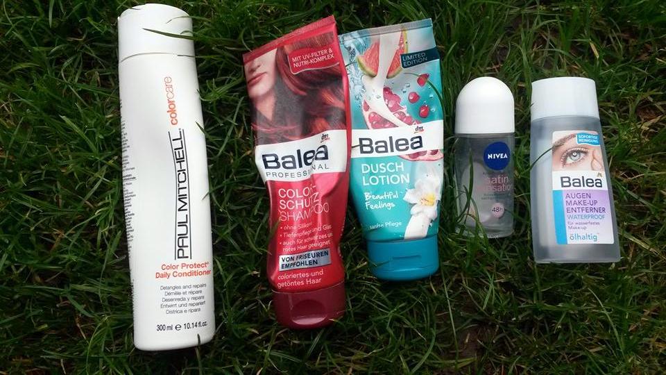 Paul Mitchell Color Protect Daily ConditionerDiese Spülung hatte ich von meinem Friseur und ich muss sagen ich fand sie echt spitze, sie hat meine Haare toll gepflegt. Ich konnte sie danach gut durch kämmen, das normale Shampoo habe ich auch aber das fand ich nicht so gut, habs dann weg gestellt.Top Balea Colorschutz ShampooDieses Shampoo hab ich schon ewig. Habe es auch immer regelmäßig nachgekauft, nur dieses mal nicht, da ich soviel Shampoos zuhause habe. :)Ich finde es sehr gut für meine Haare.Top Balea Duschlotion Beautiful FeelingsDieses Duschgel ist ein Traum, ich liebe den Duft, habe mir es mir gleich auf Vorrat geholt.Top Nivea Satin Sensation Roll-onDas Deo ist einfach Spitze hier findet ihr mein Review dazu. :)Top Balea Augenmake-up Entferner WaterproofIch fand den Entferner okay aber auch nicht perfekt, teilweise ging das Augenmake-up schlecht weg man musste ganz schön rubeln. Da ich sehr empfindliche Augen habe, waren sie sogar manchmal entzündet, ich würde dieses Produkt nicht nachkaufen.Naja