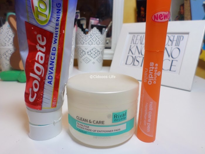 Colgate Advanced Whitening Zahncremehatte NULL Effekt :D Mehr brauch ich dazu nicht sagen.Kein NachkaufproduktRival de Loop Clean & Care Ölhaltige Augen Make Up Entferner Pads meine absoluten Lieblingsamupads :3 Allerdings wurden sie abgelöst vom bebe AMU Entferner, aber ich werde bestimmt nochmal auf sie zurückgreifen!NachkaufproduktEssence Studio Nails Nail Care PenBuh! Hat kaum Produkt abgegeben und die Spitze vom Stift war total trocken :(Kein Nachkaufprodukt