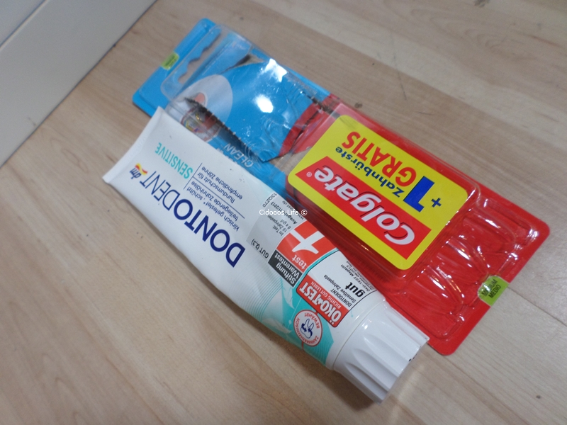 Ebenfalls zu den Basics gehören tun meine Zahnbürsten von Colgate im 3er Set und die Dontodent Zahnpasta. Wird immer nachgekauft und ich habe nichts zu beanstanden.