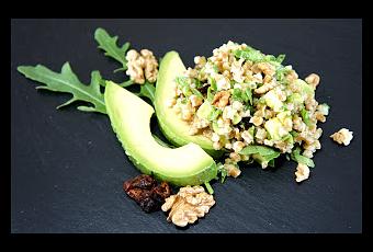 Den Dinkel im Gemüsefond gar kochen, abgießen und auskühlen lassen.Den Rucola waschen und in kleine Stücke schneiden, die Zwiebel und die getrockneten Tomaten fein hacken.