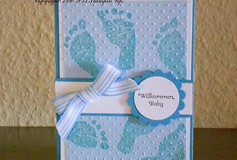 Vorhin habe ich erfahren, das meine Freundin heute eine glückliche Mutti von Zwillingen geworden ist, ein Junge und ein Mädchen, beide sind gesund und munter. Da musste ich ja schnell zwei Karten basteln und dazu passt ja hervorragend das Stempelset Babyglück. Hier habe ich die kleinen Füße auf Farbkarton aufgestempelt und noch geprägt. Wie es sich gehört, eine Karte in Rose/Zartrosa und die andere in Baiblau/Zartblau, noch einen Spruch aufstempeln und fertig. Ich hoffe, sie freut sich darüber. Ich bin schon ganz neugierig und freue mich riesig auf morgen, wenn ich sie besuche und die kleinen Wonneproppen sehen kann.
