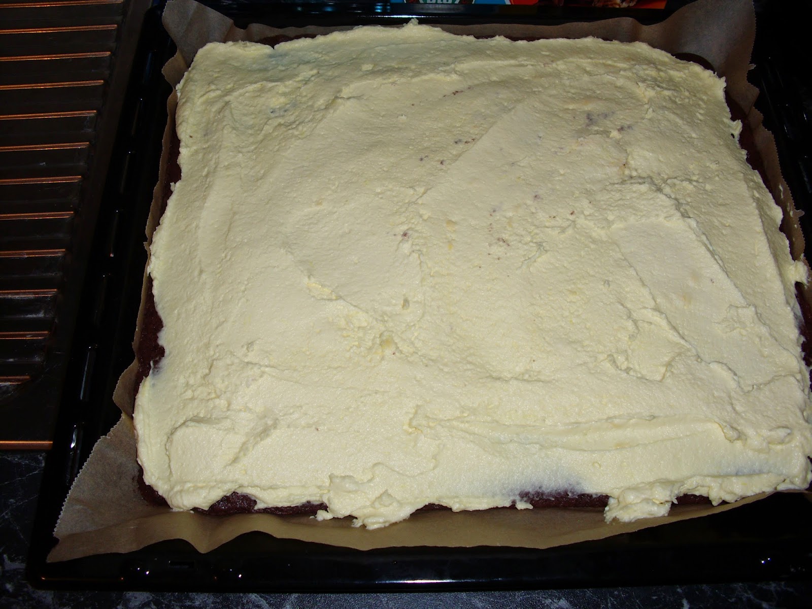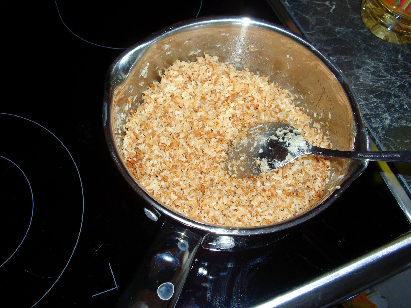 100g Butter, 100g Zucker und 100g Kokosraspeln in einem Topf erhitzen (bräunlich), abkühlen lassen und auf dem Boden verteilen.