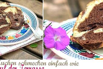 Es gibt solche Kuchen, die schmecken einfach nach Sommer auf der Terrasse. Für mich ist Marmorkuchen einer davon. Er gehört zu den Kuchen, die ich als kleines Mädel selber gebacken hab; es waren die ersten Backversuche, die einen Haufen Begeisterung, rote Bäckchen und eine riesige Sauerei in der Küche hinterlassen haben. Und wie spannend das damals war, vor dem Backofen zu sitzen und zu sehen, wie der Kuchen langsam aufgeht. Wie toll diese Ungeduld war, bis der Kuchen endlich abgekühlt ist und wie herrlich der letzte Teil der Zeremonie – die flüssige Schokolade drüber zu gießen – war… Und der Stolz, wenn der Kuchen dann geschmeckt hat, wenn die Mama beim Kaffee sagt, oh lecker.Es sind die einfachen Rezepte, die manchmal so viel Freude und vielleicht auch Erinnerungen bringen. Deswegen halte ich hier ein Rezept für einen schlichten Marmorkuchen fest – und wünsch allen, die Lust drauf haben, viel Spaß beim Nachbacken!