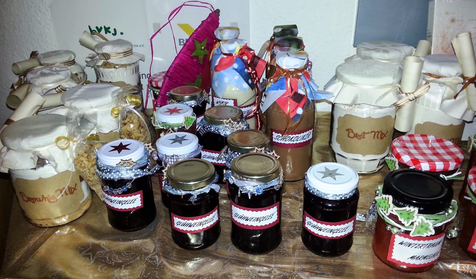 So kurz vor Weihnachten sind wir ja alle immer auf der Suche nach geeigneten Geschenken und Ideen, die nicht alltäglich sind. Es muss nicht immer etwas gekauftes sein! Im Kindergarten meines Sohnes haben wir vom Elternrat dieses Jahr einen Adventbasar organisiert und dabei jede Menge schöner Dinge und Ideen zustande gebracht, die ganz leicht nachzumachen sind und nicht nur optisch absolute Hingucker wurden :-)Vielleicht seid ihr auch noch auf der Suche nach etwas außergewöhnlichem für einen lieben Menschen...oder nach einem Geschenk, das man so nicht kaufen kann? Ich würde mich freuen, wenn unsere Ideen auch bei dem ein oder anderen gut ankommen und ich euch hiermit auch noch eine Idee liefern kann :-)Hier erst einmal unsere Bilder vom Basar. Ich war natürlich für die Koch- bzw. Backideen zuständig ;-) Die Bastelaktionen wurden von den anderen Müttern (und einem Vater - danke Heiko) durchgeführt :-) Auch einen großen Dank an unsere Erzieherin Esther, die via Pinterest wirklich großartige Ideen zusammentragen konnte.