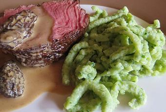 Im Bild “Kalbsrücken mit Morchelrahmsauce und Bärlauchspätzle”.