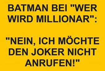 Auf Facebook teilen Vorige Folgende BATMAN BEI "WER WIRD MILLIONAR": "NEIN, ICH... Autor des Artikels : istdaslustig Zum Original-Artikel BATMAN BEI "WER WIRD MILLIONAR": "NEIN, ICH MÖCHTE DEN JOKER NICHT ANRUFEN!" Hier geht es zum Artikel Mehr Lustiges auf www.istdaslustig.de Auf Facebook teilen Vorige Folgende Das könnte Ihnen gefallen Mehr