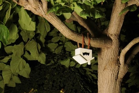 Doch schaut man sich andere Fledermauskästen an, ist das an Ledergurten aufgehängte Haus vielmehr ein graphisches Zeichen, als ein wirklich sinnvolles Fledermausquartier.