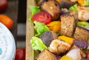 Nach einem kurzen Blick über die dieswöchige Ausbeute, stand ziemlich schnell fest – es gibt einen rustikalen Brotsalat! Einige von Euch werden jetzt skeptisch die Stirn runzeln – ein Salat aus Brot soll sommerlich leicht sein? Ja, vertraut mir – vielleicht erinnert Ihr Euch auch noch an meinen leckeren Panzanella mit grünem Spargel vom letzten Jahr. Doch diesmal habe ich auch an alle Fleischesser gedacht, denn neben allen Zutaten für einen knackigen Salat und herrlich frischem Brot, fand ich auch noch zarte Hähnchenbrust in meiner Box. Und damit sich auch die Vegetarier am Tisch wohl fühlen, gibt es als fleischlose Alternative knusprige Ziegenkäsebällchen.