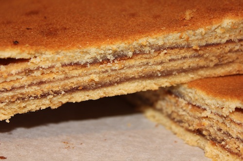 Zugegeben, ein bisschen Zeit und Geduld muss man wirklich mitbringen, aber ab und zu darf es ja auch etwas aufwendiger sein. Probiert es einfach mal aus. Setzt euch mit nem guten Buch und einer Tasse Tee (oder auch Glühwein ;-)) in die Küche und wartet auf die wunderbaren Gerüche, die bald aus dem Ofen kommen =).Den Ofen auf 230 °C vorheizen. Die Kastenform mit etwas Butter einfetten. Die Butter, Vanillezucker, Puderzucker und Eier cremig schlagen und die Sahne mit dem Mehl unterrühren. Nun die Himbeermarmelade erwärmen und eventuell sieben oder pürieren.Wenn der Ofen vorgeheizt ist, 2-3 EL Teig auf dem Boden der Form gleichmäßig verstreichen. Im Ofen in ca. 3-4 Min. hellbraun backen. Ihr müsst je nach Ofen etwas rumprobieren, dann bekommt ihr ganz schnell den Dreh raus. Nun wieder 2-3 EL Teig darauf streichen und 3-4 Min. backen. Dann die Himbeermarmelade sehr dünn darauf verteilen. Wieder 2-3 EL Teig darauf verteilen und backen. Diesen Vorgang wiederholt ihr, bis der Teig aufgebraucht ist. Den Kuchen in der Form gut abkühlen lassen.