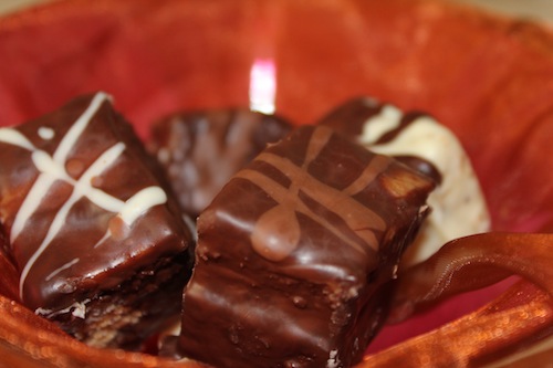 Nun die Kuvertüren im Wasserbad schmelzen lassen. Eventuell etwas neutrales Öl oder Palminfett hinzugeben, damit die Kuvertüre flüssiger wird.Den Kuchen vorsichtig aus der Form nehmen. Die Marzipanrohmasse zwischen zwei Gefrierbeuteln dünn ausrollen und passgenau auf den Kuchen legen. Dann den Kuchen in etwa 2,5 - 3 cm dicke Scheiben schneiden. Die Scheiben wiederum in gleich große Würfel schneiden. Jetzt könnt ihr je nach Belieben die Würfel mit einer Gabel in eine der Kuvertüren tauchen und auf Pergamentpapier trocknen lassen. Später dann die andersfarbigen Würfel verzieren.Wenn ihr die Baumkuchenwürfel verschenken wollt, kauft doch eine hübsche kleine Box, legt sie mit etwas Seidenpapier aus oder gebt die Würfel in Pralinenkapseln, ich verspreche euch, es wird ein Erfolg!Viel Spaß damit und eine schöne restliche Vorweihnachtszeit!!!