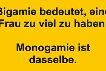 Auf Facebook teilen Vorige Folgende Bigamie bedeutet, eine Frau zu viel zu haben.... Autor des Artikels : istdaslustig Zum Original-Artikel Bigamie bedeutet, eine Frau zu viel zu haben. Monogamie ist dasselbe. Hier geht es zum Artikel Mehr Lustiges auf www.istdaslustig.de Auf Facebook teilen Vorige Folgende Das könnte Ihnen gefallen Mehr