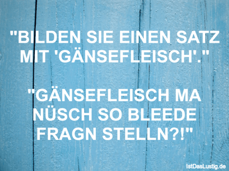Auf Facebook teilen Vorige Folgende "BILDEN SIE EINEN SATZ MIT 'GÄNSEFLEISCH'."... Autor des Artikels : istdaslustig Zum Original-Artikel "BILDEN SIE EINEN SATZ MIT 'GÄNSEFLEISCH'." "GÄNSEFLEISCH MA NÜSCH SO BLEEDE FRAGN STELLN?!" Hier geht es zum Artikel Mehr Lustiges auf www.istdaslustig.de Auf Facebook teilen Vorige Folgende Das könnte Ihnen gefallen Mehr