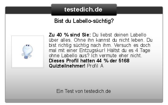 Lip ButterÜber den kann ich anscheined nicht genug von schreiben :DAlso ich sag mal das er in meinen Jahresfavoriten war. Und hier findet ihr eine Review zu den Lip Butters Beauty, Fashion and Whatever: Labello Lip Butter ReviewUnd jetzt kommen wir mal zum Thema Labello Sucht. Meine Freundin weiß das ich einige Labellos besitze und hat mir diesen Quiz geschickt. Irgendwie ganz witzig und ihr könnt auch mitmachen. Klickt einfach auf " Bist du Labello-süchtig " und macht den Test.Hier ist übrigens mein Ergebnis :D
