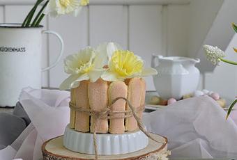 - Das Törtchen mit einem heißen Messer vom Rand lösen und vorsichtig aus den Ringen heben. Das Löffelbiskuit zurechtschneiden und mit eurer Klebemasse an das Törtchen kleben.