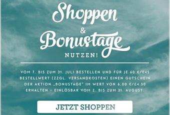 Vom 7. bis zum 31. Juli gibt es im Rahmen der Aktion Bonustage Gutschein-Aktion bei jeder Bestellung für je 60 € Bestellwert (Katalogpreise zzgl. Versandkosten) einen Gutschein im Wert von 6,00 €. Für eine Bestellung ab € 120,- gibt es zwei Gutschein usw…