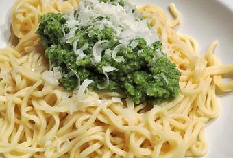 Und daraus jetzt ein „Pesto“, zusammen mit frischen, selbst gemachten Spaghetti – das ist wie Sommer, zumindest auf dem Teller