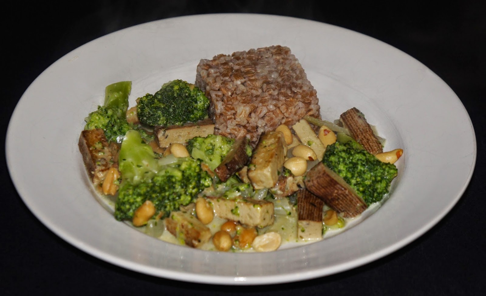 Brokkoli putzen, in Röschen zerteilen, in Salzwasser bissfest blanchieren und danach abschrecken.Zwischenzeitlich den Tofu klein schneiden und in Öl kross anbraten, aus der Pfanne nehmen und die klein geschnittene Zwiebel anrösten, mit Gemüsefond ablöschen und das Erdnussmus einrühren.