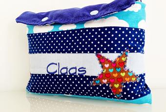 Vor ziemlich genau einem Jahr ist der kleine Claas zur Welt gekommen. Zur Geburt gab es für Mami und Kind eine Windeltasche mit eingesticktem Namen. Jetzt, 1 Jahr später hat der kleine Große sich ein Halstuch mit Namen gewünscht. Diesmal habe ich ausgeschnittene Stoffbuchstaben mit der Nähmaschine appliziert.
