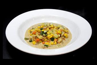 Erneut in der Pfanne etwas Öl erhitzen, die Zwiebel glasig dünsten, Karotten dazugeben und den verbliebenen Gemüsefond dazugeben, einig Minuten köcheln lassen, sodass die Karotten bissfest sind. Die Zucchiniwürfel dazugeben und mit garen.