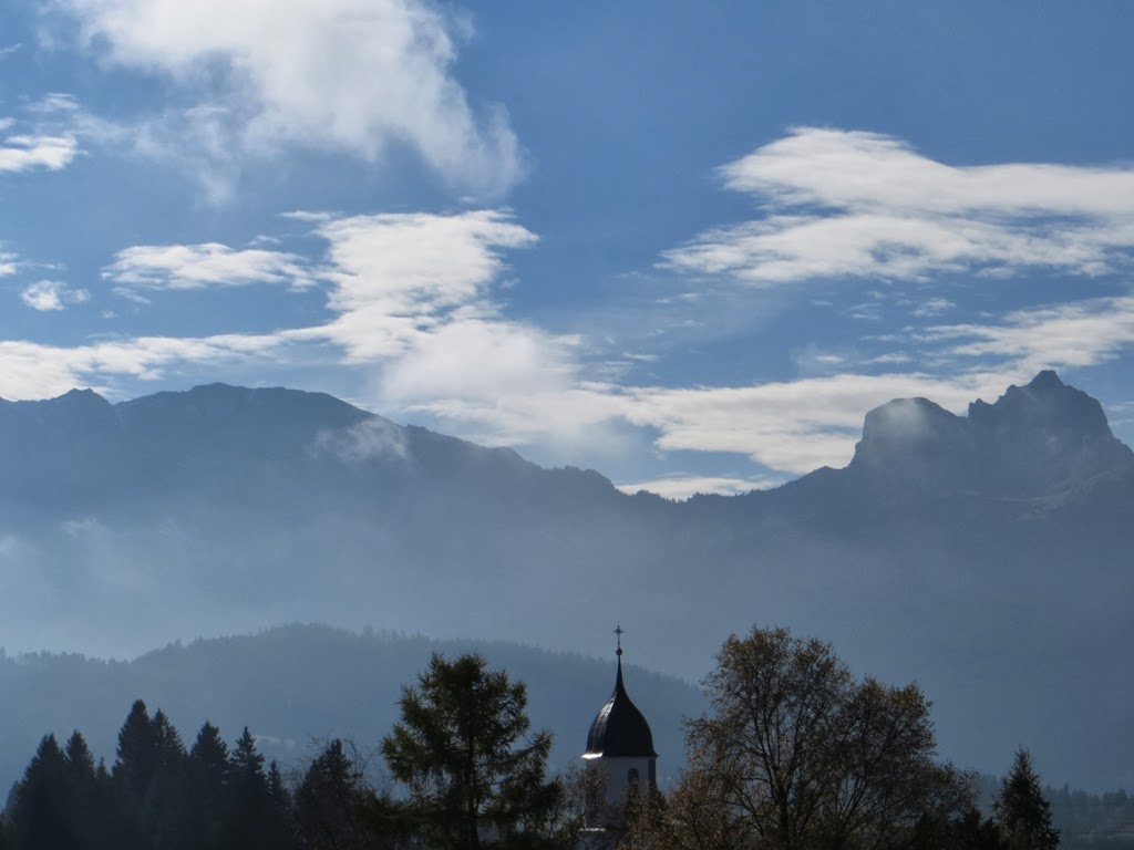 Wir aber, die wir den Drachen bezwungen haben, lassen uns auch von der Kirche nicht fesseln. Vielmehr verlassen wir diese, um ihren Turmhelm im Gegenlicht zu genießen. (Der markante Berg rechts ist der Aggenstein bei Pfronten.)