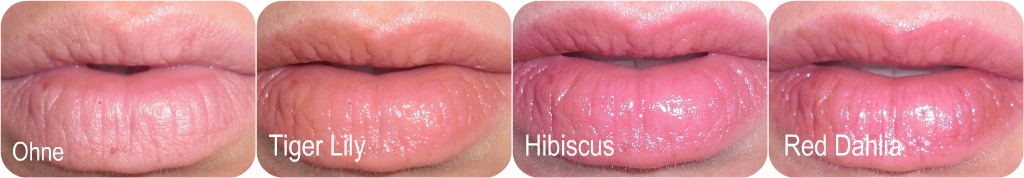 Hier seht Ihr alle Farben nochmals auf den Lippen. Die Frage ist natürlich, ob man bereit ist, 8,00 € für einen Lippenbalsam auszugeben. Bei diesen würde ich spontan sagen ja, WENN man sich langsam an Farbe auf den Lippen trauen will (ohne gleich einen knalligen Lippenstift kaufen zu wollen) oder permanent leicht glossig getönte Lippen trägt. Die Haltbarkeit ist wirklich sehr gut, ebenso wie das Pflegegefühl auf den Lippen.