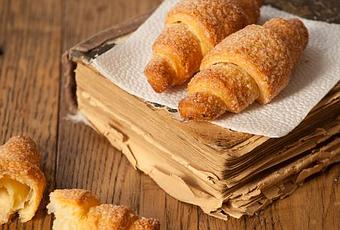 Die Hörnchen mit einem verquirlten Ei bestreichen, mit Kristallzucker bestreuen und im aufgeheizten Backrohr auf mittlerer Schiene ca. 20 bis 25 Minuten backen.