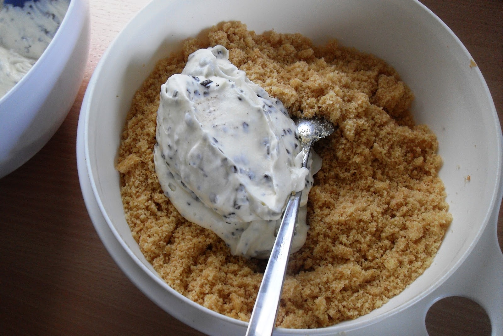 Zubereitung: Den Kuchen fein zerbröseln - wenn möglich, eine Küchenmaschine oder einen Pürierstab benutzen. In eine große Schüssel umfüllen.